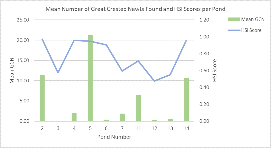 This graph shows the correlation between the mean number of newts found in each pond compared to the HSI score. (Figure credit: Isabel Commerford).