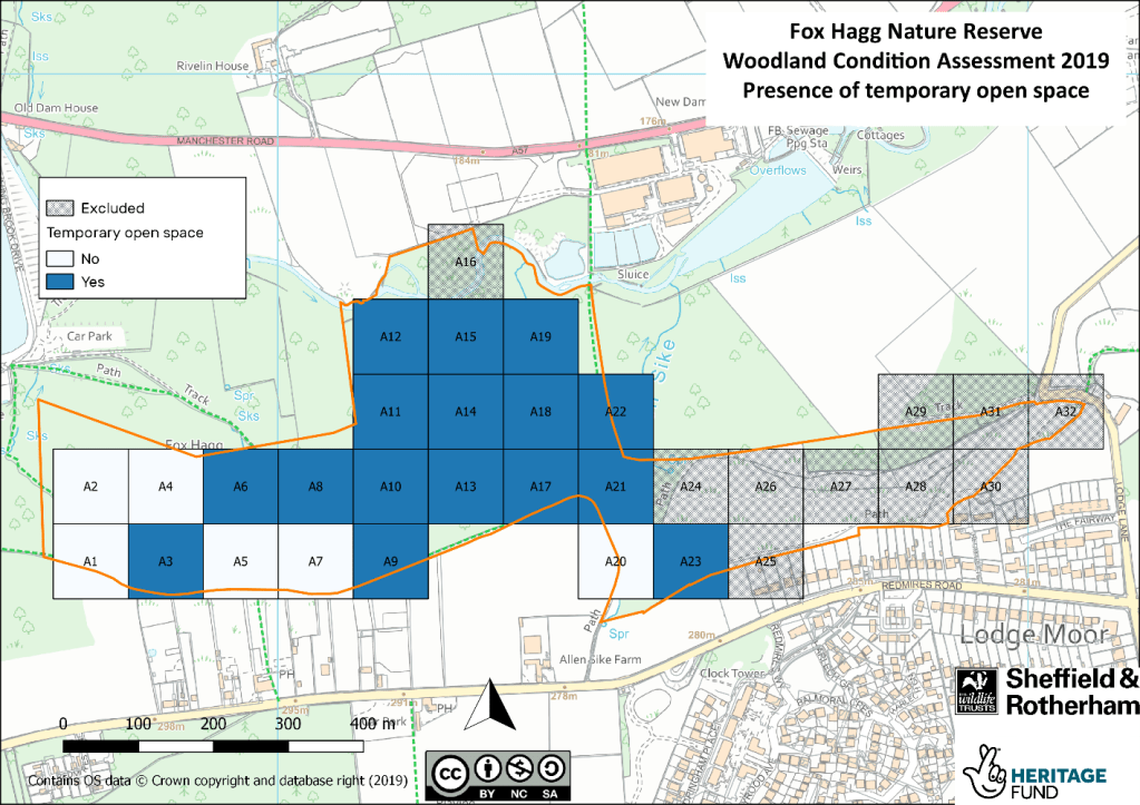 Map of Fox Hagg showing grid cells with open space. The majority of the reserve is open woodland, making it suitable to support a Willow Tit population (Figure credit: Patricia Malcolm).